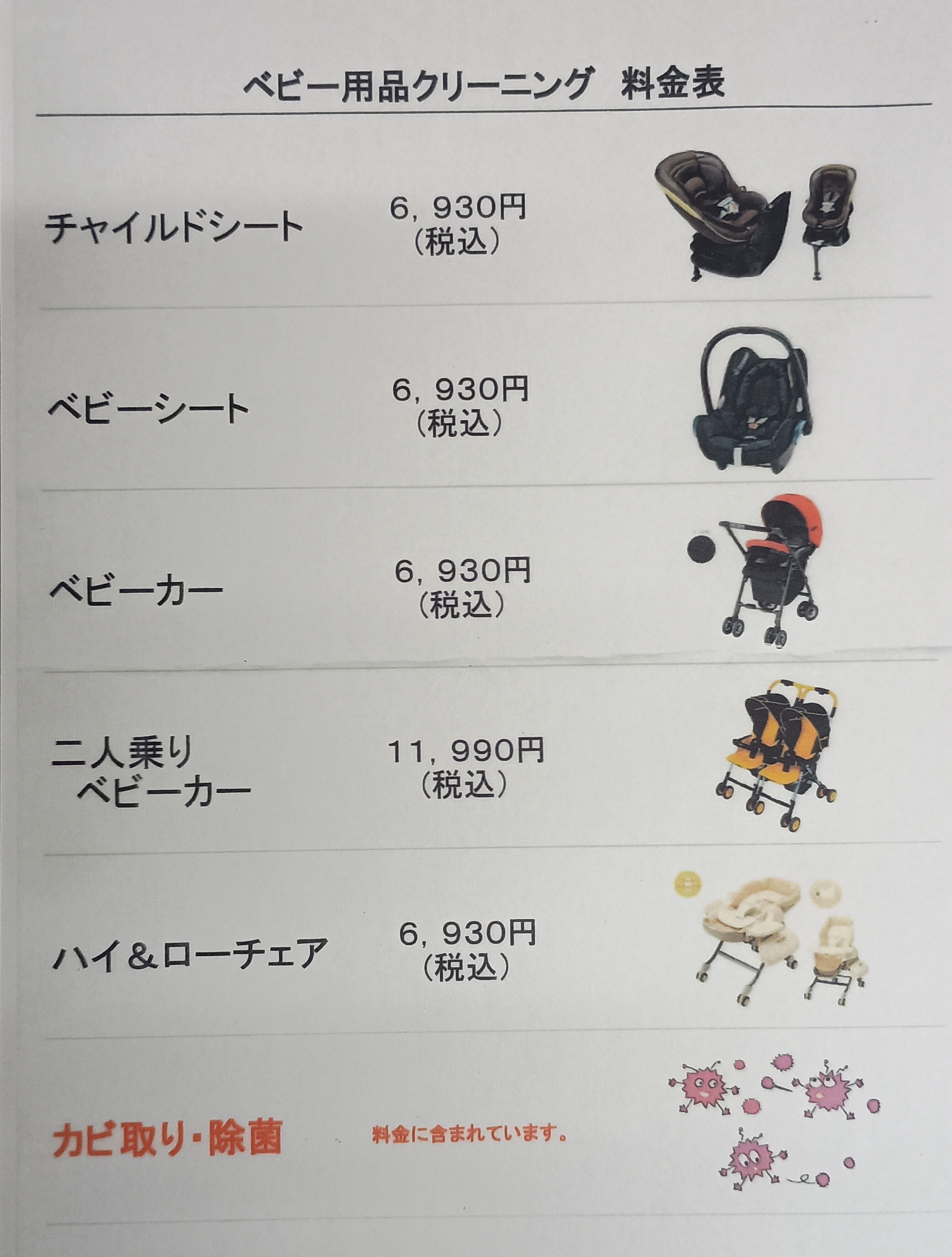 ベビー用品クリーニング料金表